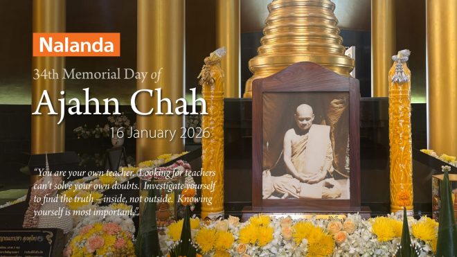 Today, 16 January 2026 marks the 34th anniversary of Ven. Ajahn Chah’s passing. Traditionally on this day, his disciples gather at his main monastery – Wat Nong Pah Pong in Ubon Ratchathani, to observe the memorial and recollect his life and teachings. Known for his wisdom, compassion, and ability to express profound Dhamma in simple and direct ways, Ajahn Chah guided many to observe the way things truly are and cultivate wise reflection in daily life.