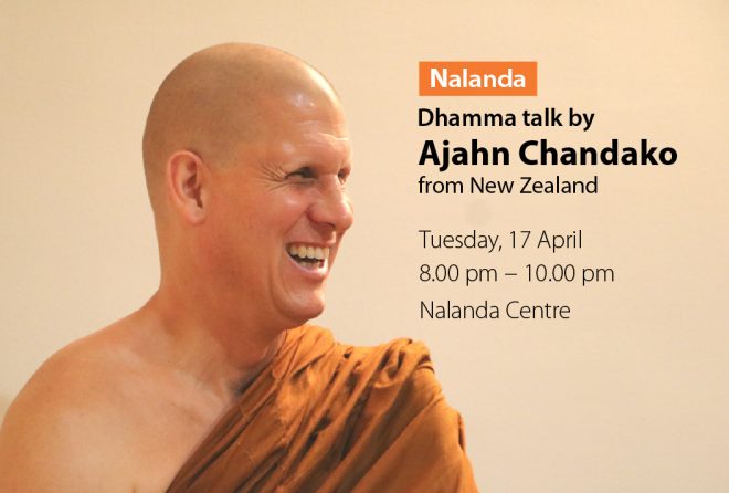 Nalanda Centre is honoured to host Venerable Ajahn Chandako from New Zealand on Tuesday, 17 April for a Dhamma talk, starting at 8.00pm. This will be his second visit to Sri Serdang in as many years.