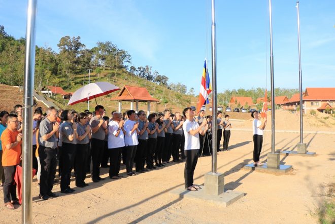 Nalanda youths raising the flags to the chant of ‘Jayamangala Gatha‘, symbolising the significance of the project for the future generations of Malaysian Buddhists.