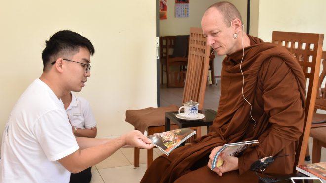 Nalanda Deputy Youth Leader Bro. Chan Yu, an alumni of Nalanda Dhamma School sharing with Venerable the commemorative book of the School’s 20th anniversary.