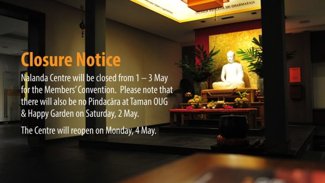 Nalanda Centre will be closed from 1 – 3 May for the Members’ Convention.