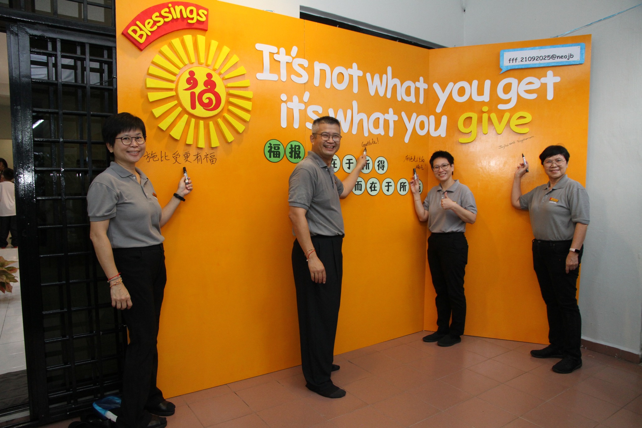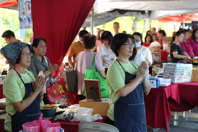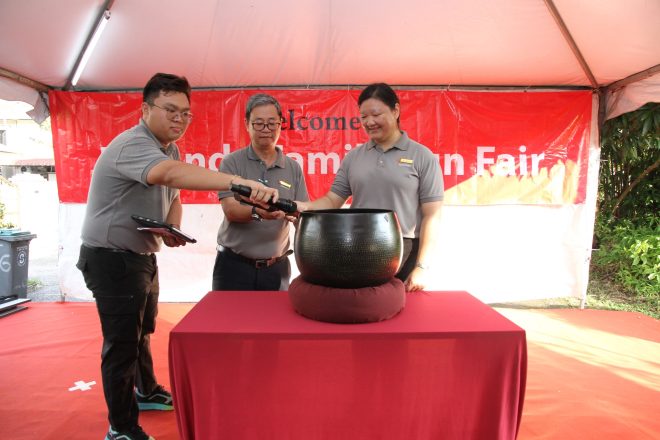 The Family Fun Fair at NEO Centre J.B. has just been launched! Since early this morning, Nalanda members, stall operators and volunteers have been joyfully preparing over 70 stalls offering a variety of food, drinks, decorations, clothes and daily-use items for sale.