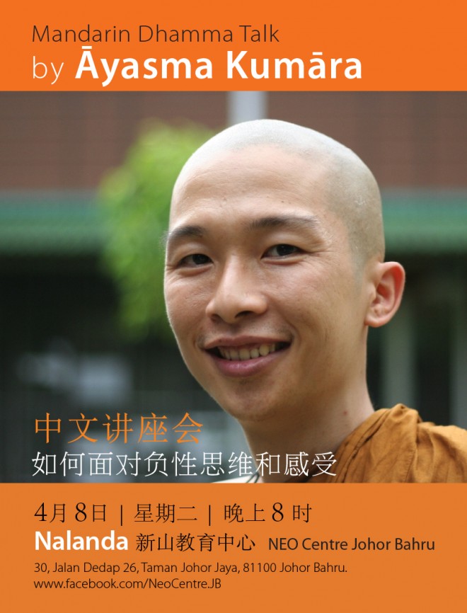 Ayasma Kumāra from Sāsanārakkha Buddhist Sanctuary (SBS) Taiping will be residing and giving a Dhamma Talk at NEO Centre Johor Bahru on 8 April 2014.  The Mandarin Talk is titled, “如何面对负性思维和感受”.  All are welcome to attend this public talk.