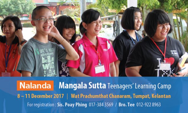 Nalanda Dhamma School, Dhammarakkhita, Mettarama Meditation Centre and Persatuan Peranakan Cina Kelantan are co-organising a learning camp for teenagers from 8 – 11 December 2017, themed “Mangala Sutta”. Teenagers of 13 – 17 years old are welcome to discover in this camp the way to gain the highest blessings in life by understanding and practicing the teachings in the Mangala Sutta. Participants in this camp get to learn the Dhamma through interesting talks, group activities, interactive sessions, and quiet meditation.