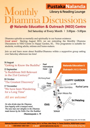 Starting August 2012, Pustaka Nalanda will organise the Monthly Dhamma Discussions at Nalanda Education & Outreach (NEO) Centre in Happy Garden on the 3rd Saturday afternoon of every month. [ Location map ]