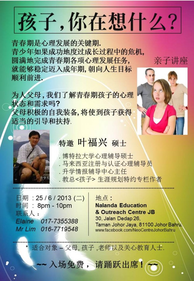 NEO Centre Johor Bahru will be organising a special talk by Counselor Yap Hock Heng (Bro. Aggaphala) on understanding our children’s and teenagers’ growing psychological and emotional needs, so as to help them in fulfilling their potential in life.