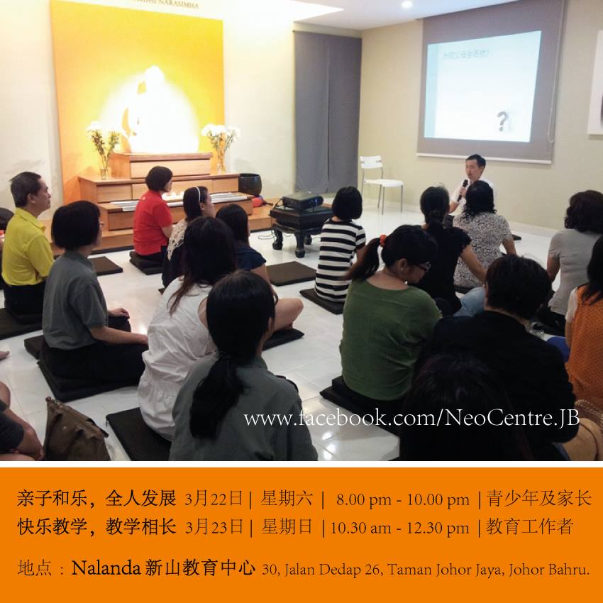 Nalanda 新山分会特邀心理辅导老师叶福兴为我们主讲两场教育讲座。我们欢迎您的出席。请与您新山的家人与朋友分享此活动讯息。任何疑问,请咨询 : Elaine 017-735-5388 或 Mr. Lim 016-771-9548。