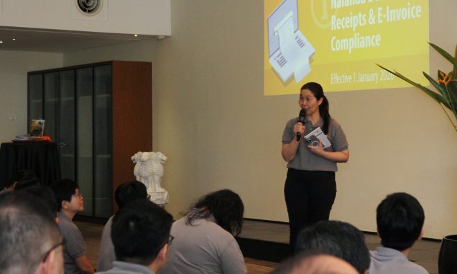 Nalanda Treasurer Sis. Doris Tan sharing with members how Nalanda will comply with e-invoicing guidelines set by LHDN.
