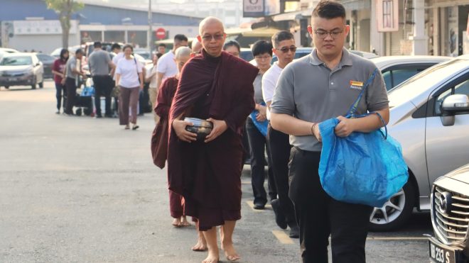 The first monthly Pindacāra of 2026 at Pasar Basah Bazar Rakyat, Seri Kembangan, was held on Saturday 17 January. It was a rare and inspiring occasion with four members of the Saṅgha from Dhamma Earth – Ven. U Paññasami, Ven. Sudanta, Sayalay Nanacari and Sayalay Mettā Viharī – walking peacefully and mindfully on alms-round.