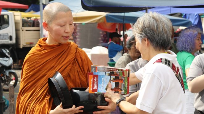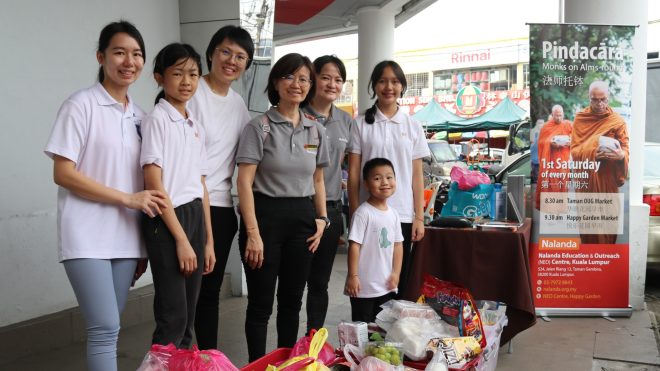 Last Saturday 1 November, the Pindacāra programme was especially endearing with the presence of Ven. Sucitta a bhikkhu (monk), Ven. Ayya Sanghamitta a bhikkhunī (nun), upāsakas (male lay followers), and upāsikās (female lay followers). The community at the O.U.G. and Happy Garden markets made offerings to the Sangha members with joy and reverence.