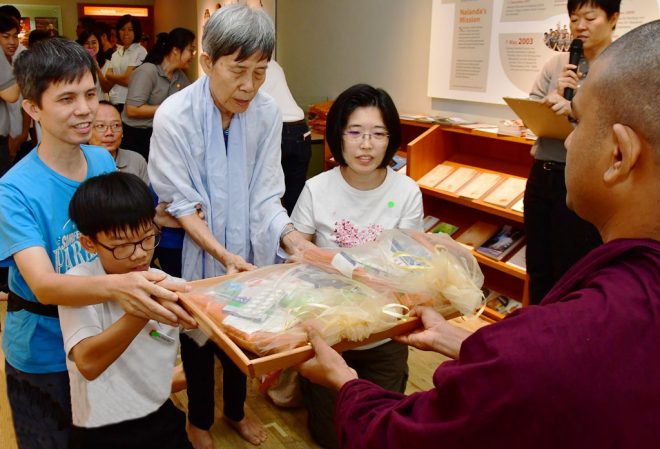 The offering ceremony commenced with Nalanda’s immediate past-President, Bro. Lee Kong Foo and Chairman of Nalanda Kuala Lumpur Branch, Bro. Ng Eek Chon presenting robes and requisites to the venerable Sangha member. Devotees, young and old, followed with their offerings as everyone rejoiced in their generosity and devotion.