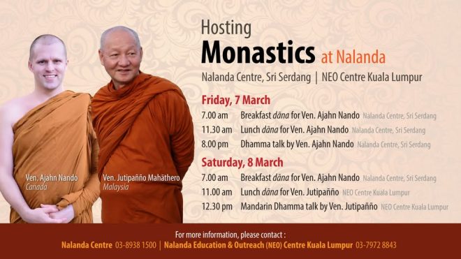 On Saturday afternoon, we will receive Ven. Jutipañño Mahāthero at NEO Centre Kuala Lumpur. We will offer lunch dāna before Venerable delivers a Mandarin Dhamma talk at 12.30pm. All are welcome!