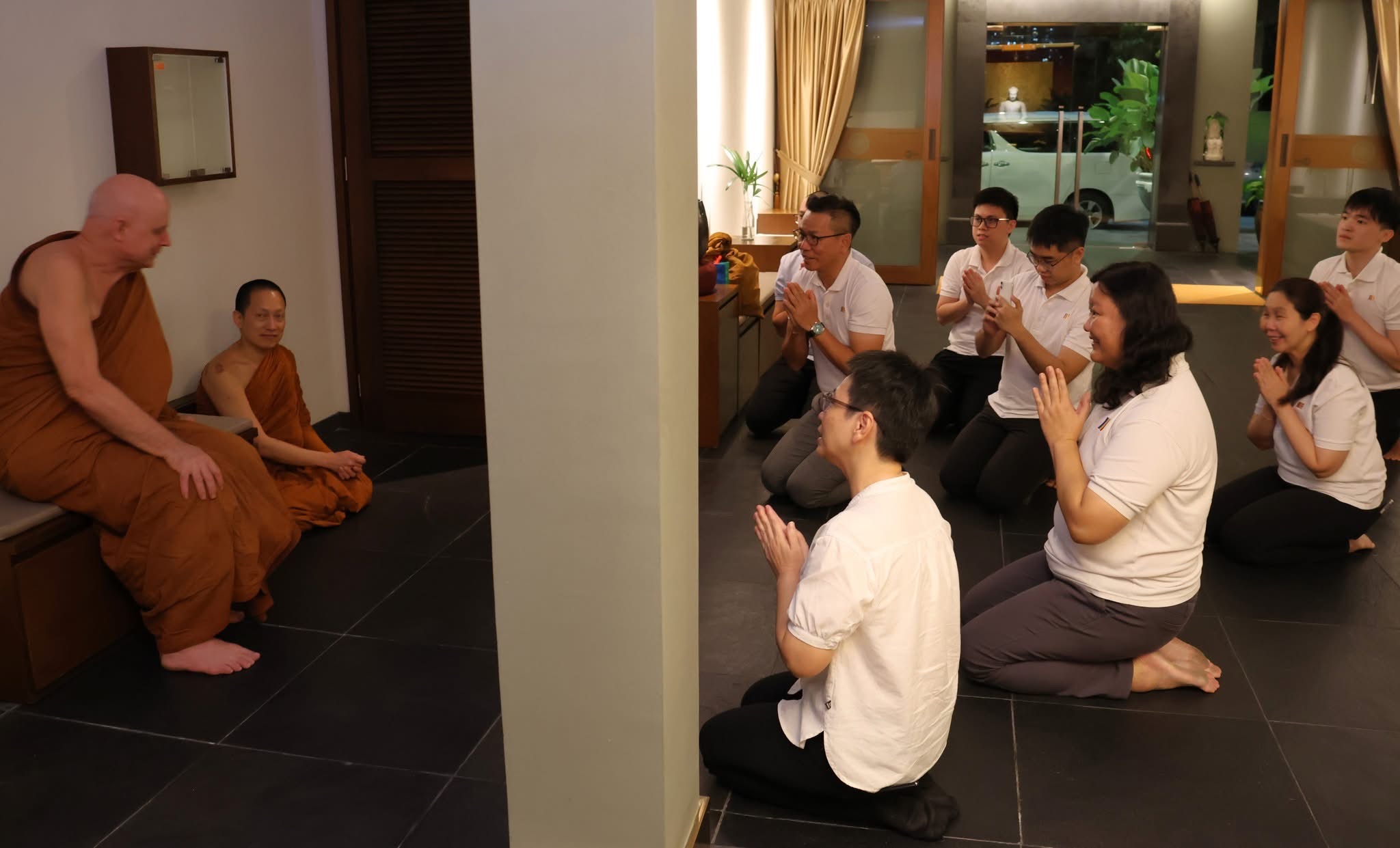 Members welcoming Ajahn Jayasaro and Ajahn Tul.