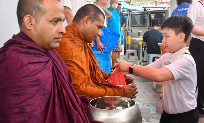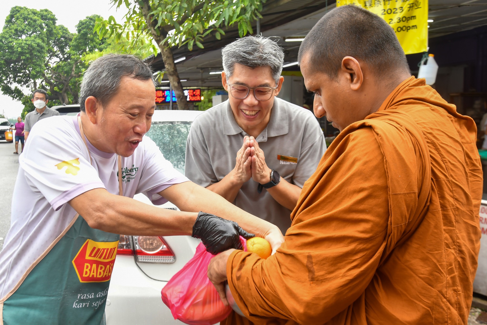 Last Saturday 4 May, the community at the O.U.G. and Happy Garden markets partook in the meritorious deed of giving in the monthly Pindacāra (monks on alms-round) programme. Often on the look-out on the morning of the first Saturday of the month, market-goers and stall vendors prepared their offerings generously, with the sincere intention of doing good.