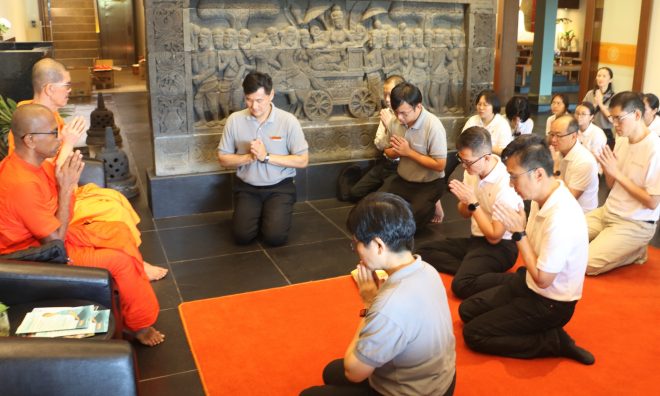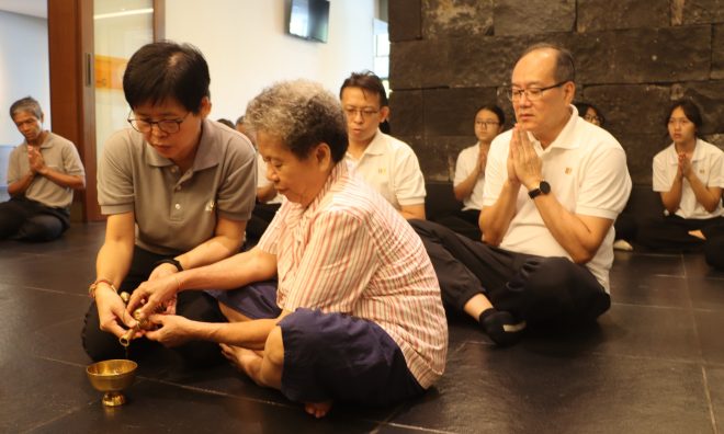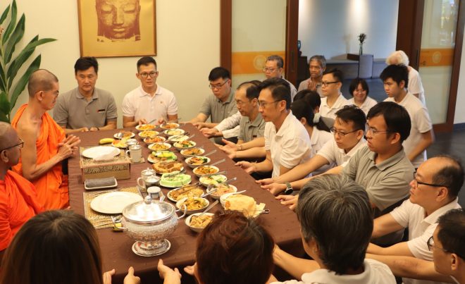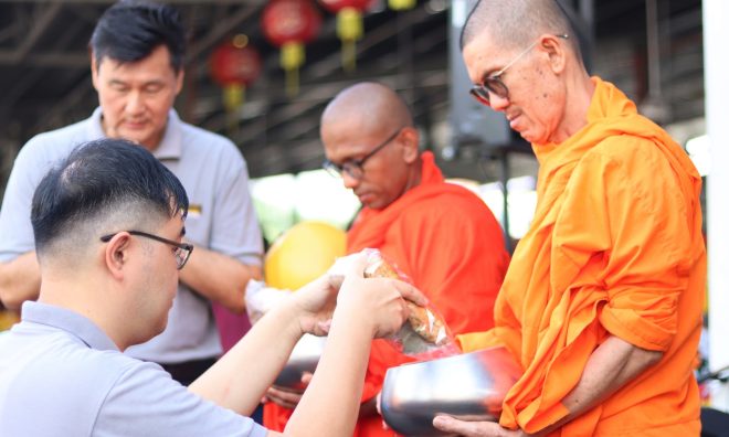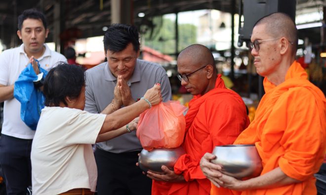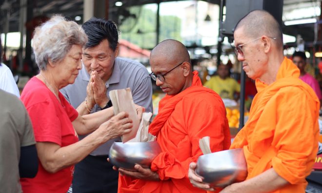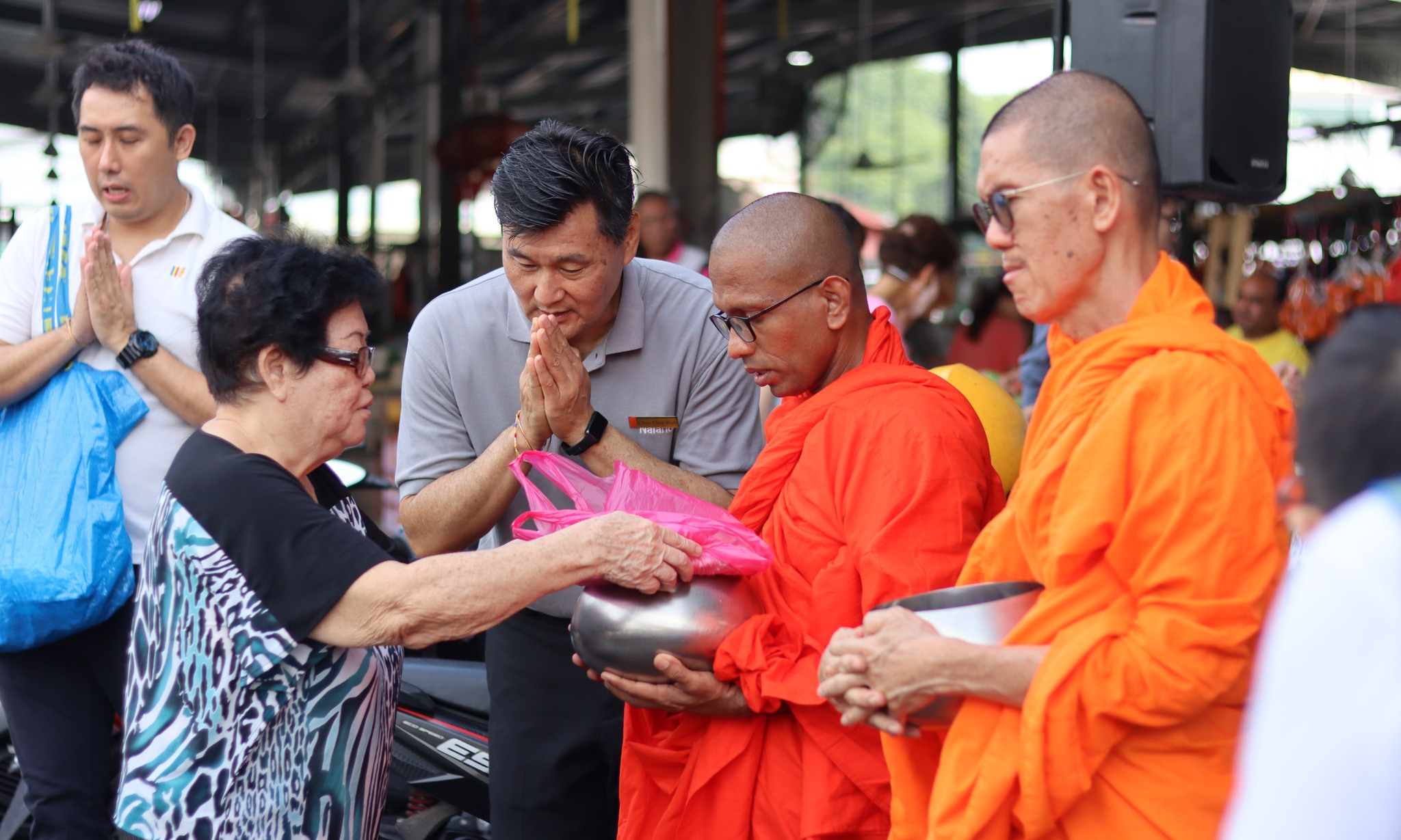 On Saturday 18 October, Nalanda members and volunteers gathered at the Seri Kembangan morning market for the monthly Pindacāra (monks on alms-round) programme with faith and joy.  As the venerable monks walked calmly through the market lanes, many devotees and stall owners paused their busy routines to respectfully offer alms with palms joined in reverence.
