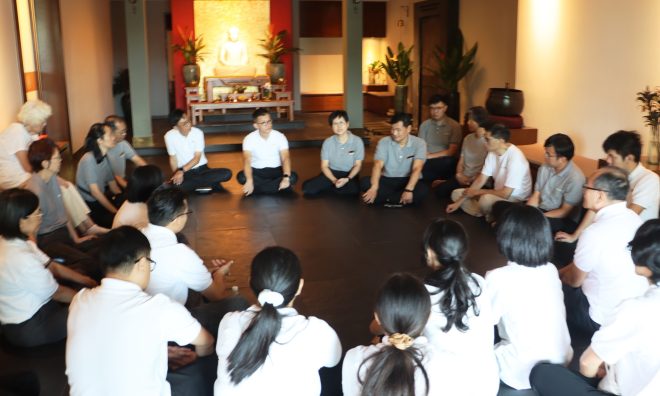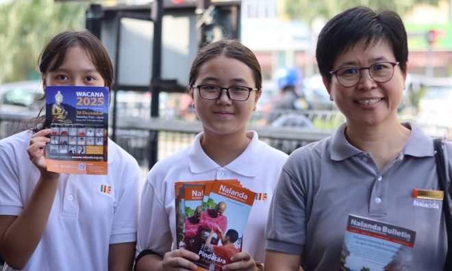 Volunteers engaging with the public to share the purpose of Pindacāra and about Nalanda’s educational programmes.
