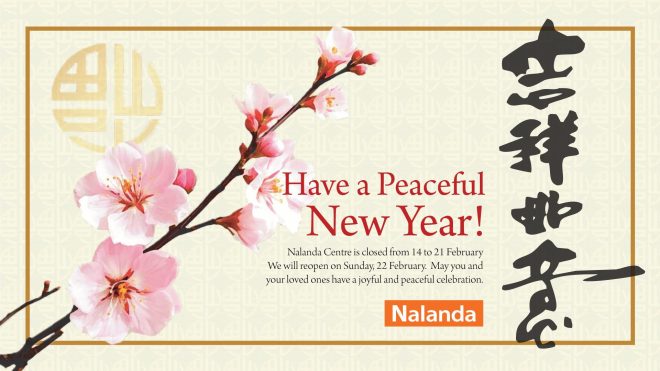 We would like to inform you that that Nalanda Centre, Youth Centre and Pustaka Nalanda (the Library) in Sri Serdang will be closed for a week from Saturday, 14 February to Saturday, 21 February in conjunction with Lunar New Year celebrations.