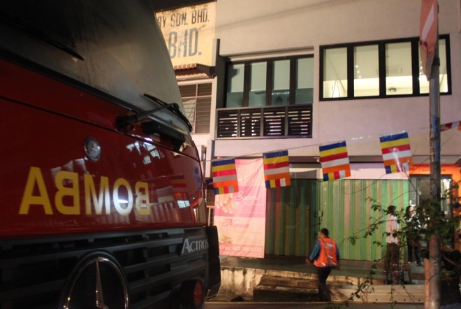 At approximately 10.20pm last night (14 April), Nalanda Centre received an emergency call reporting that thick black smoke was billowing from the roof of NEO Centre in Happy Garden. Nalanda officers who had just finished the Uposatha Day Evening Service rushed to the scene 13km away at Taman Gembira, Kuala Lumpur to investigate.