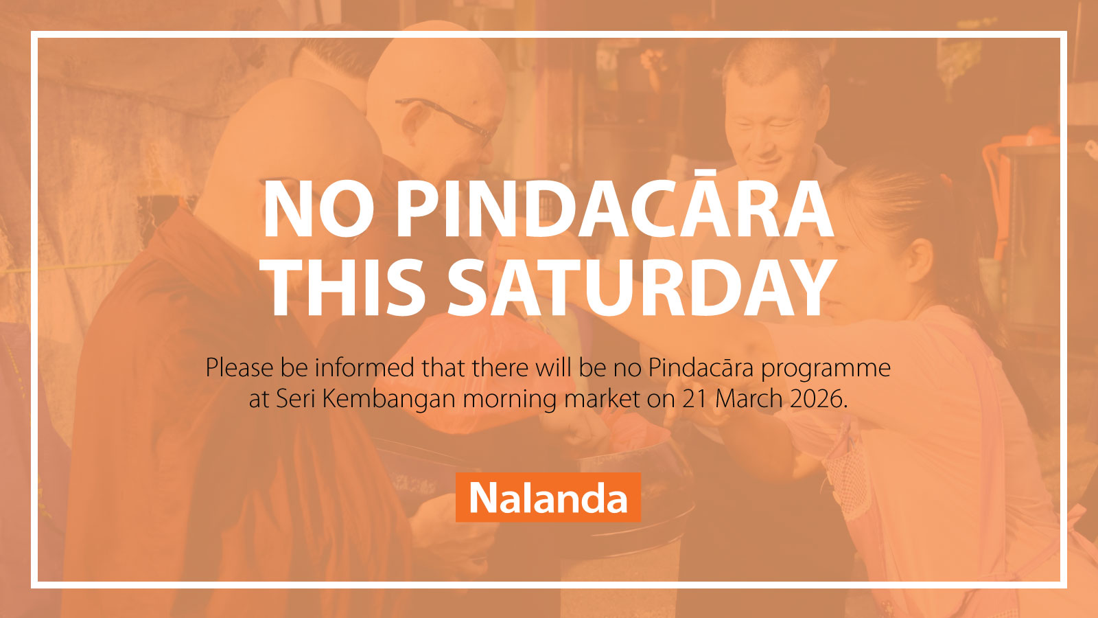 Kindly take note that there will not be Pindacāra at Bazar Rakyat Seri Kembangan on Saturday, 21 March as Nalanda members and volunteers will be away for a Dhamma Retreat.