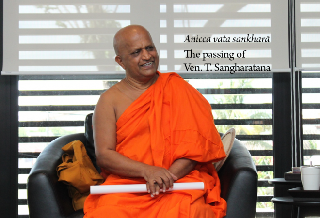 It is with deep respect and a heavy heart that we announce the passing away of Venerable T. Sangharatana Nāyaka Thero earlier today, 17 March 2018. He was well regarded for his social service in Bangalore, India, as the founding member of the Maha Mahinda Dhammaduta Propagating Society, which serves the socio-welfare needs of the lower strata of Indian people.