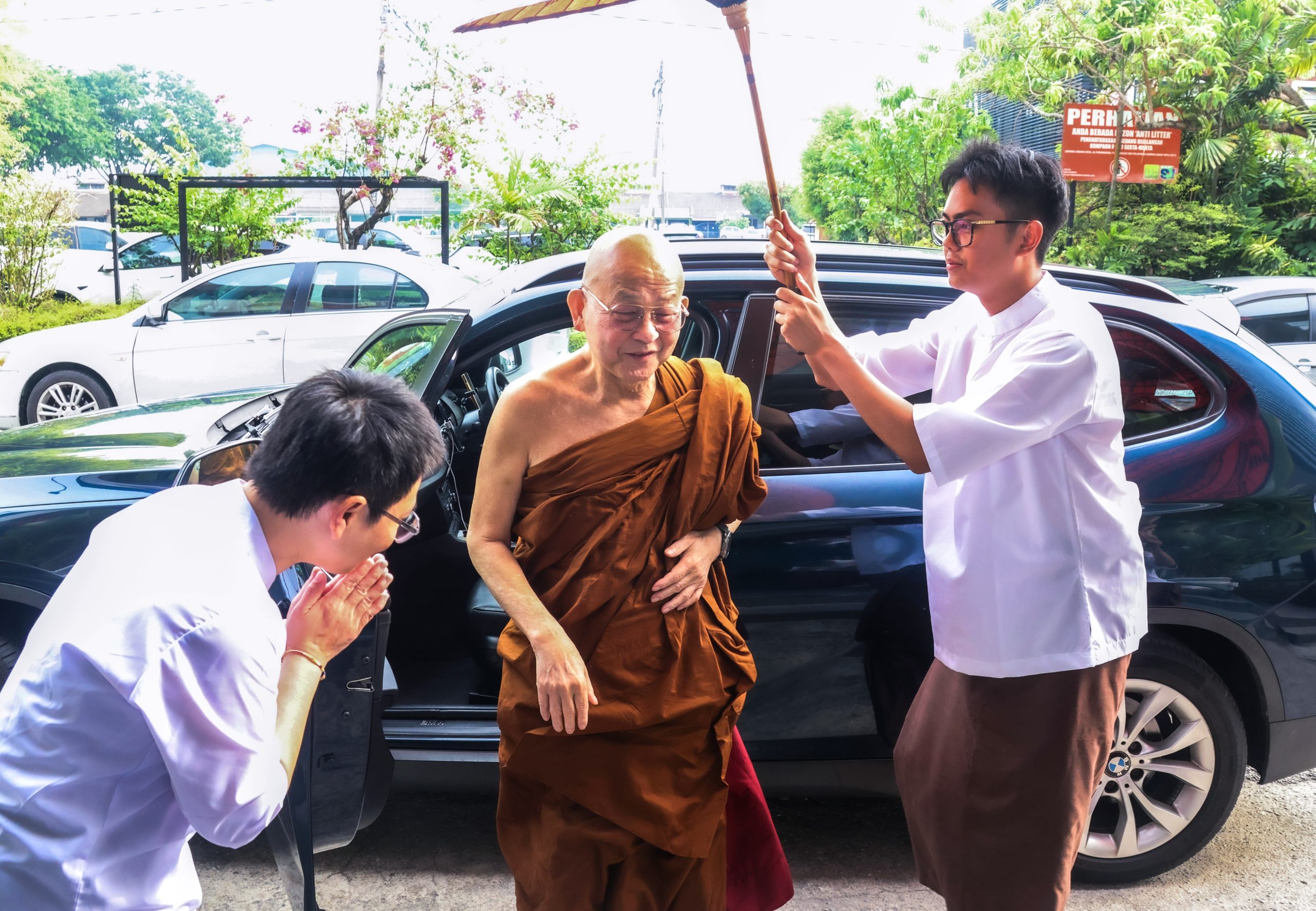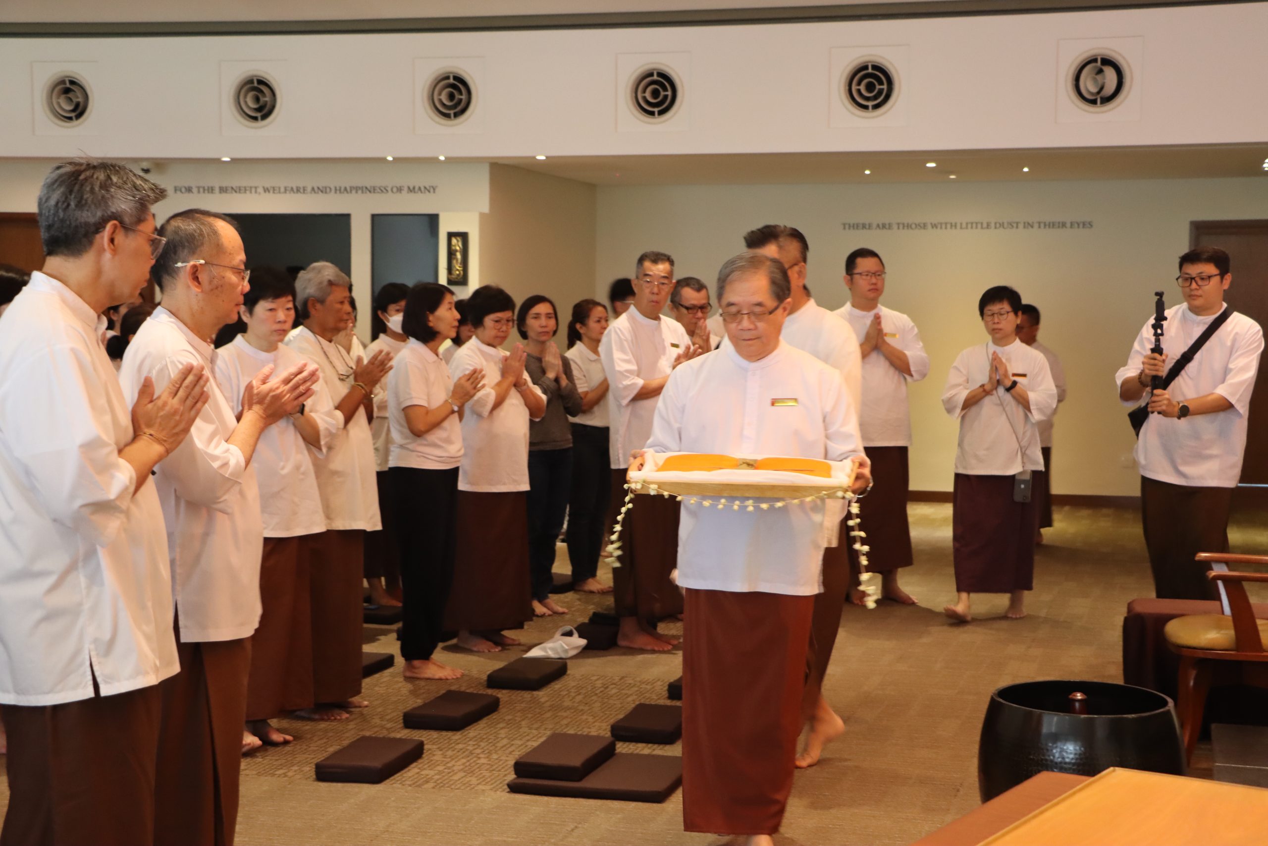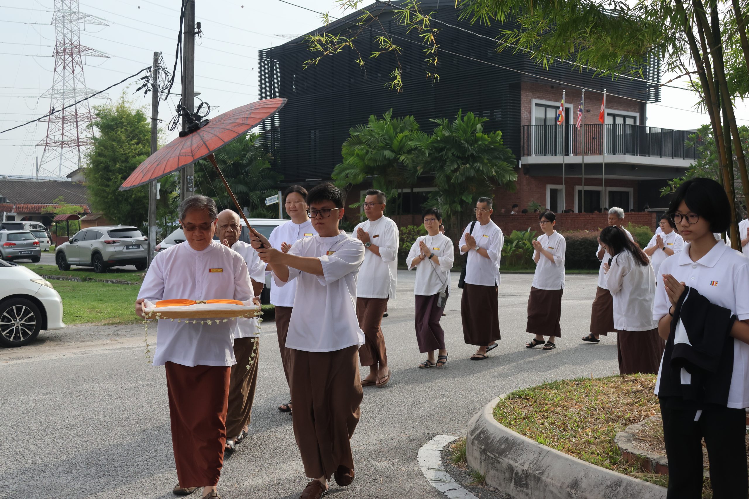 Bro. Tan Siang Chye ceremoniously carrying the robes in procession, marking the final route the late Venerable walked on his last visit to Nalanda.