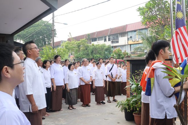 Raising the Malaysia, Buddhist, and Nalanda flags.