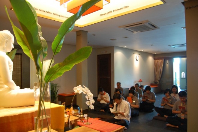 Bro.Tan leading Nalandians in a pūja in memory of Acharya Buddharakkhita on 27 September 2013.