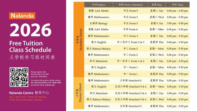 Free School tuition class schedules for the coming 2026 academic year at Sri Serdang and Johor Bahru are now available at https://www.nalanda.org.my/free-school/.  Classes will commence mid-January 2026 and registration can be made at https://shorturl.at/naduc.