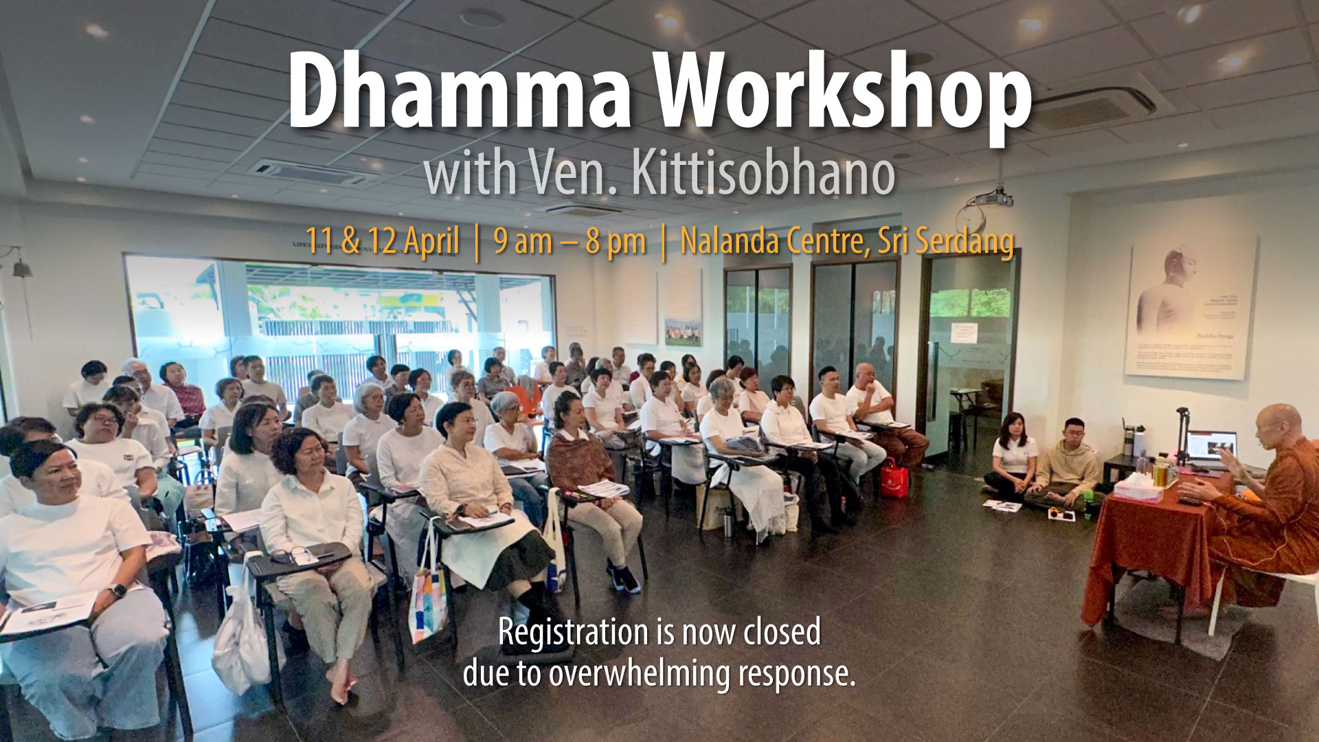 Registration for the Dhamma workshop with Ven. Kittisobhano on 11 & 12 April 2026 is now closed due to overwhelming response.