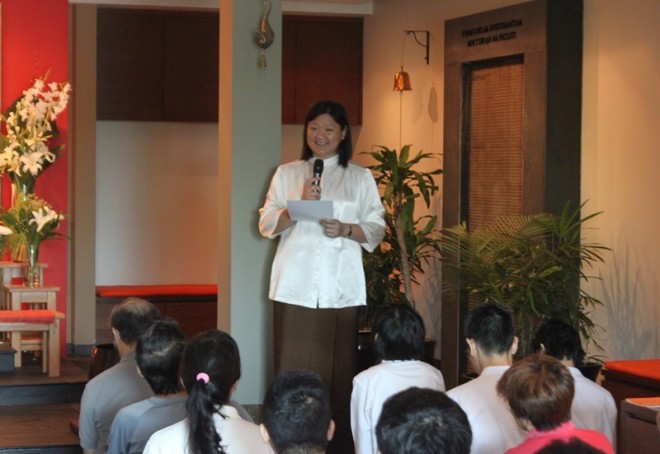 Sis. Buddhinī Tan delivering a message to all Nalandians on behalf of the Board of Management on the monthly ‘Samaggi Day’.