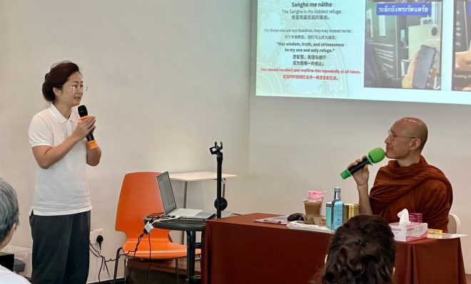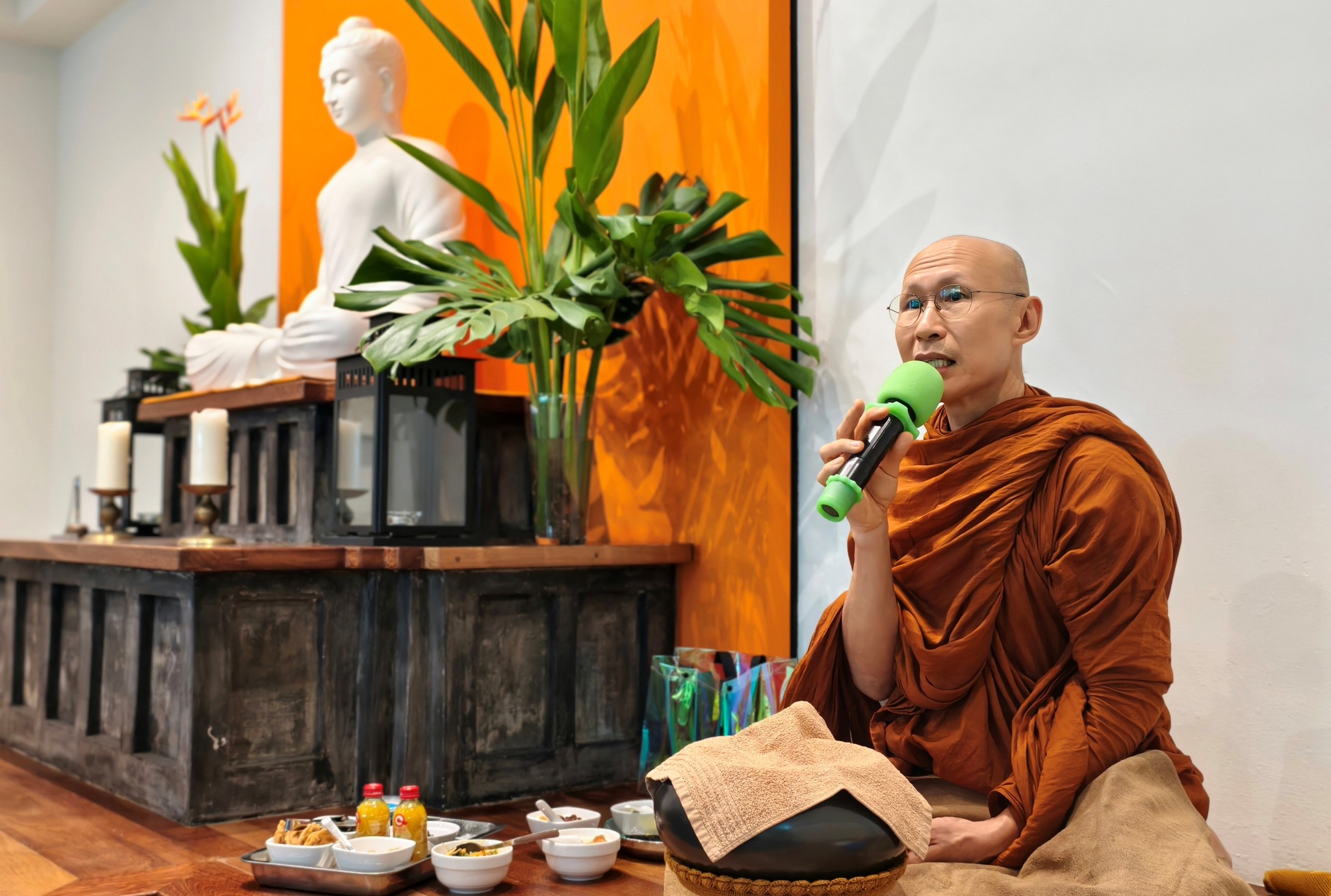 Venerable explained that while generosity, morality, and meditation exist in many traditions, the distinctive strength of the Buddha-Dhamma lies in its wisdom that leads one beyond suffering.  He highlighted that suffering arises when we mistakenly take the temporary aggregation of the five aggregates as a permanent “self”.  Because of this misunderstanding, attachment develops, and suffering follows. Thus, practice involves observing, understanding, and gradually releasing this attachment.