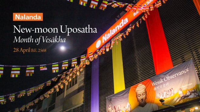 Today is the New-moon day of the holy Vesakhā Month. On these Uposatha (observance) days, the laity devote themselves to a day of restraint, meditation and cultivation of mindfulness. Some may observe the Eight Precepts and listen to or read Dhamma teachings attentively.