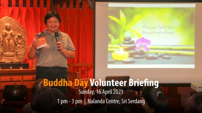 We welcome all ‘Buddha Day’ volunteers to attend the Volunteer Briefing at 1pm this Sunday 16 April, at Nalanda Centre. The briefing includes an introduction to the Buddha Day programmes from 3 to 7 May, and a familiarisation of your roles with the team leads. We thank you in advance for stepping forward to play a part in this auspicious event and wish you happy service!