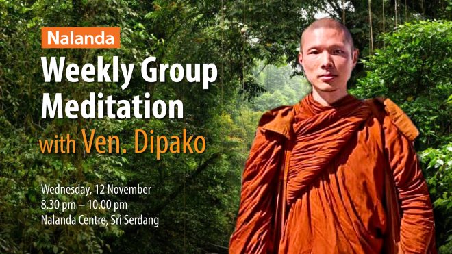 Join us for the Weekly Group Meditation this Wednesday, 12 November. The programme will begin at 8.30pm with chanting and meditation, followed by a Dhamma talk by Ven. Dīpako.